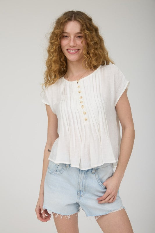 Effortless style meets everyday comfort in the Emmie Drop Shoulder Blouse. This lightweight woven top features a charming henley neckline with half-button closure and a relaxed drop shoulder silhouette that's perfect for layering or wearing solo. Delicate pintuck detailing adds visual interest, while the unlined construction keeps things breezy and breathable. A versatile piece that transitions seamlessly from casual outings to laid-back weekends.