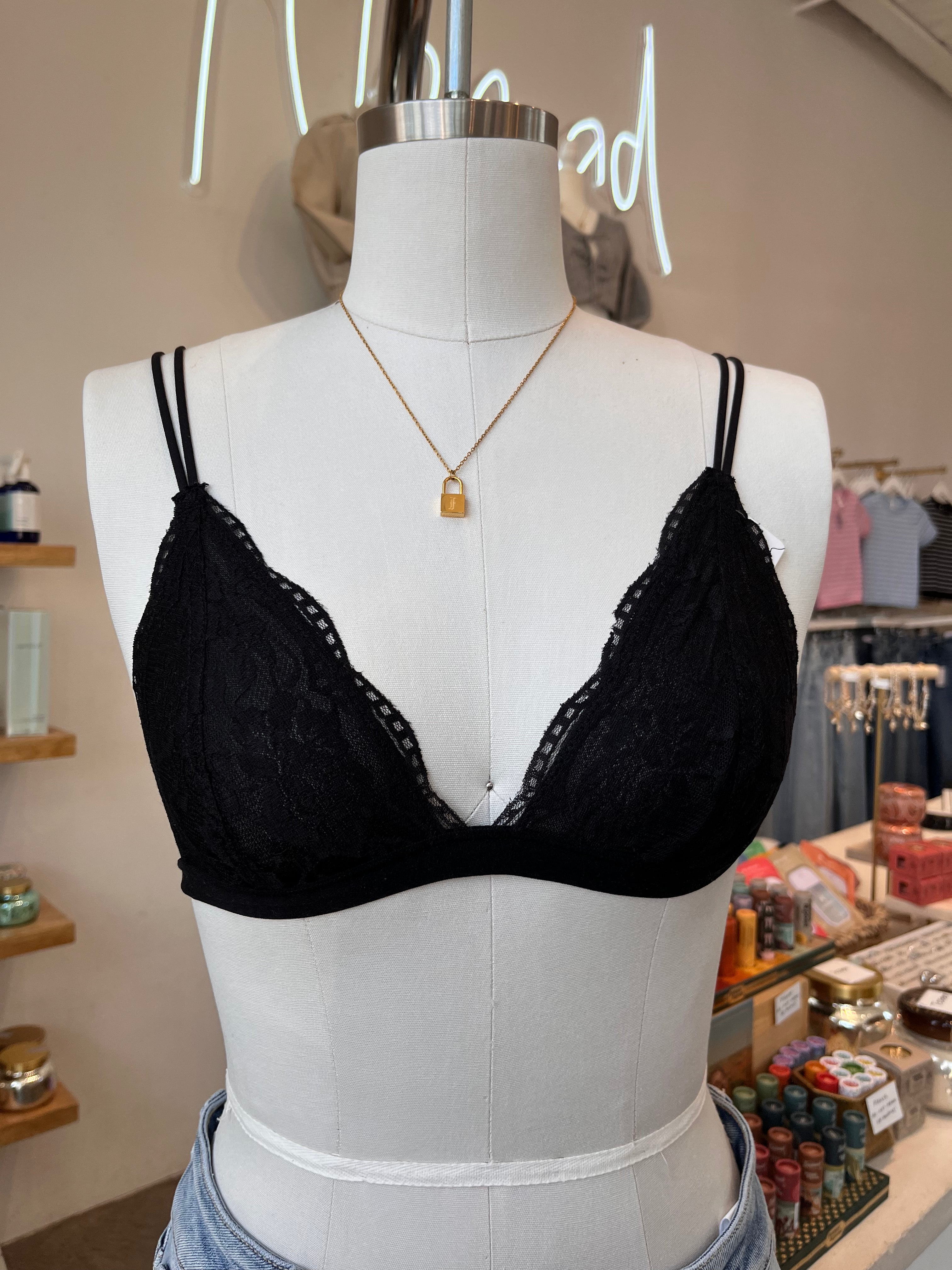 Floral sheer lace triangle low-cut unpadded mesh lined bralette, adjustable straps, and back hook closure. (SIZE FIT: S/M - 32A, 32B, 34A, 34B and M/L - 34B, 34C, 36B) 95% Nylon, 5% Spandex