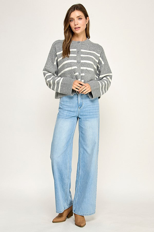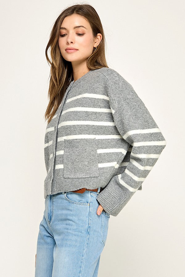 Slip into the Grey Skies Knit cardigan for a cozy yet stylish vibe. Its bold stripes bring timeless flair, while the button front and drop shoulders make layering a breeze. With handy front patch pockets, this relaxed-fit piece keeps things effortlessly functional and fun. Crafted from a soft blend of acrylic, polyester, and spandex, it’s your go-to for playful comfort all day long.