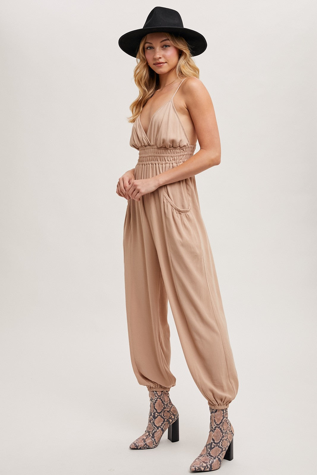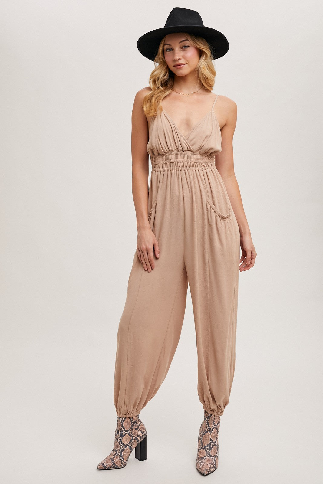The adjustable sleeveless strap smocked jumpsuit with pockets is a stylish and practical addition to any wardrobe. Featuring adjustable straps for a customized fit, this jumpsuit has a smocked bodice that provides a comfortable and flattering silhouette. The addition of pockets adds functionality, making it perfect for casual outings or relaxed weekends. Pair it with sandals or sneakers for an effortlessly chic look. -Model is 5'9" and wearing a Small