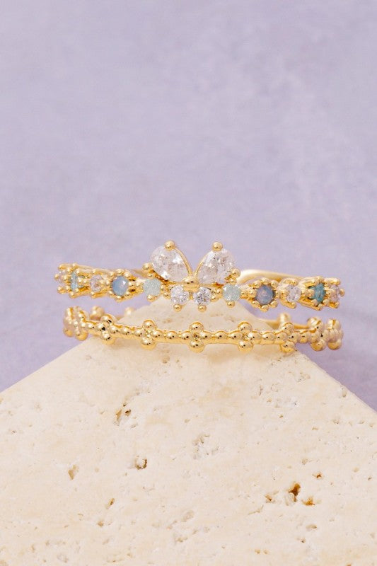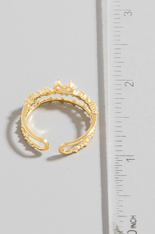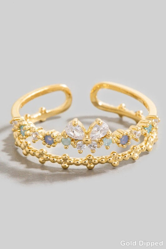 Spread your wings with this stunning gold-dipped butterfly ring! Featuring a glamorous two-row design adorned with sparkling cubic zirconia, it's the perfect statement piece for anyone who loves a little sparkle and whimsy. Crafted from quality brass with brilliant stone accents, this ring brings playful elegance to any look—whether you're dressing up for a night out or adding flair to your everyday style. Let your inner butterfly shine!
