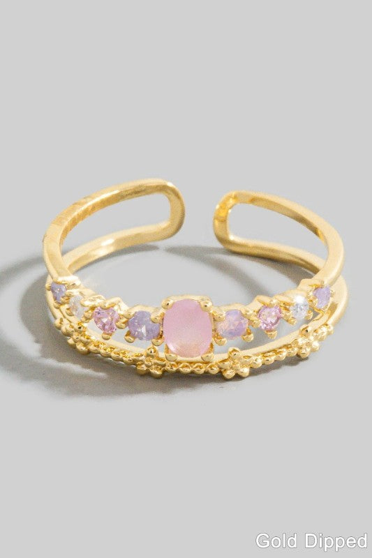 Sparkle with style in this gold-dipped stunner that's all about making a statement. Two rows of cubic zirconia studs catch the light from every angle, giving you that luxe look without the luxury price tag. Whether you're dressing up for a night out or adding pizzazz to your everyday vibe, this ring brings the glamour. It's the kind of accessory that says you know how to have fun with fashion—bold, brilliant, and unapologetically you.