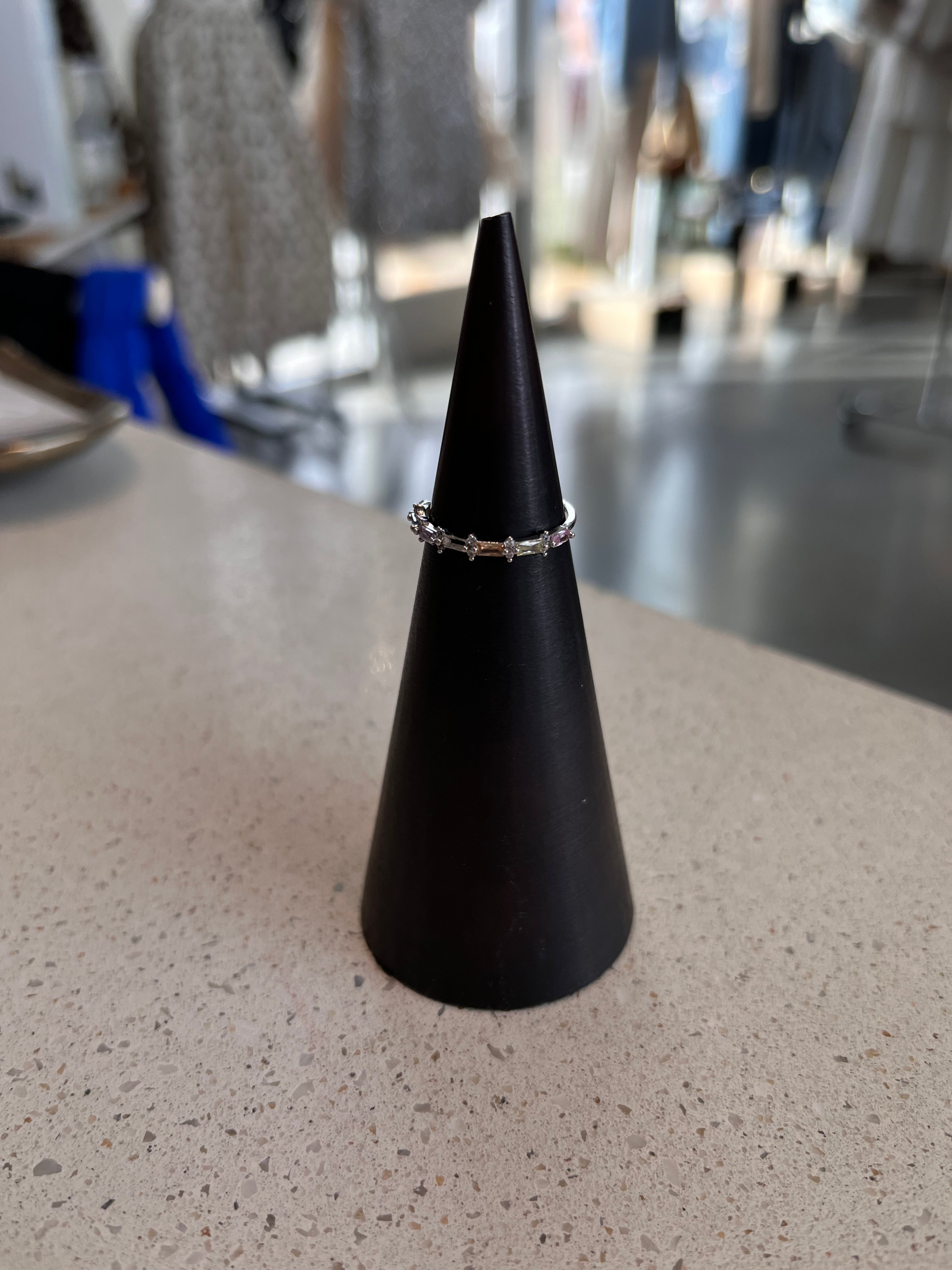 Elevate your everyday style with the Color Park Ring, a striking silver band that celebrates vibrant self-expression. This eye-catching design features six rectangular diamonds in bold hues—yellow, blue, purple, orange, green, and pink—separated by delicate spacers and paired stacked circular studs for dimensional detail. Each gemstone catches the light differently, creating a dynamic rainbow effect that transitions beautifully throughout your day. Perfect for those who refuse to choose just one favorite color, this ring makes a confident statement while maintaining an elegant silver foundation. A conversation starter that's as unique as you are.