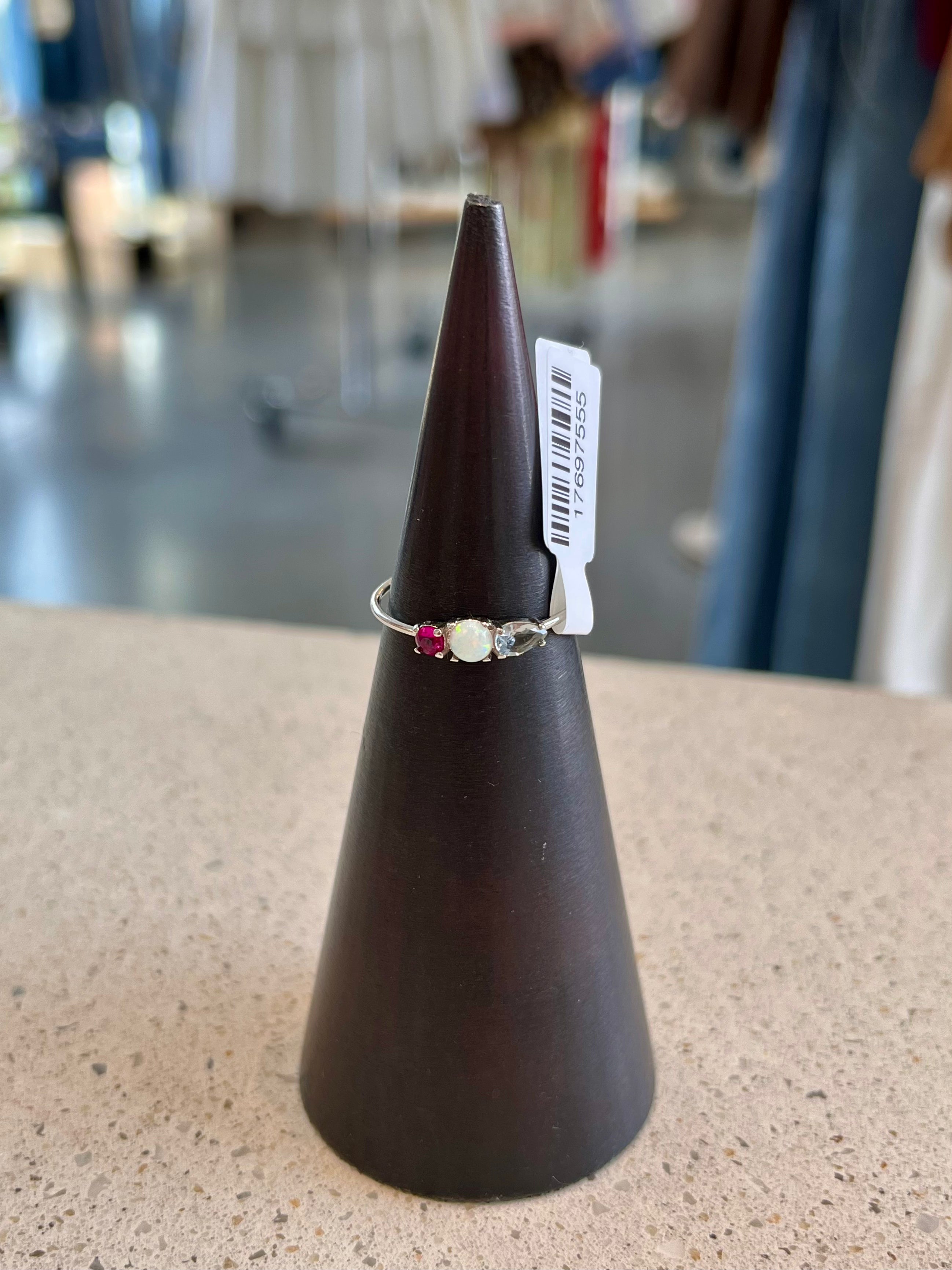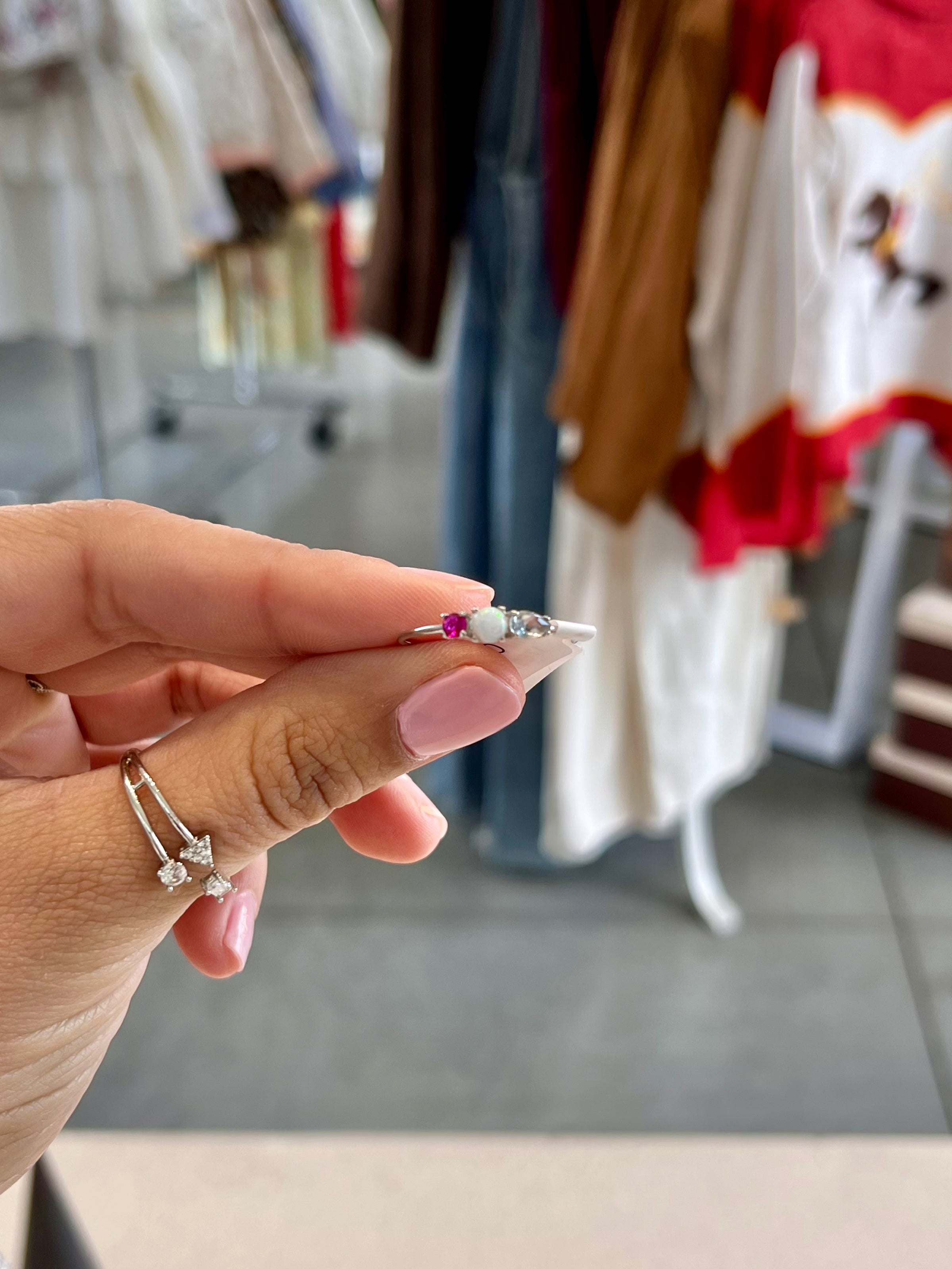 Elevate your everyday elegance with this stunning Multi Gem Ring, a harmonious blend of sophistication and color. Featuring a lustrous silver band adorned with a captivating circular opal at its heart, flanked by a delicate pink gemstone and an elongated blue-tinted diamond, this piece captures light beautifully from every angle. Perfect for those who appreciate distinctive jewelry that tells a story, this ring transitions seamlessly from casual to formal occasions. The thoughtful arrangement of gemstones creates a balanced, eye-catching design that celebrates your unique style and refined taste.