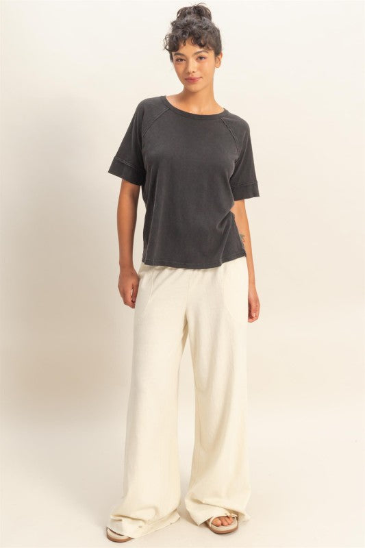 Experience the laid-back appeal of our Acid-Wash Raw Seam Raglan Short Sleeve Tee. Crafted from soft cotton with a distinctive acid-washed finish, this tee features a timeless round neckline and comfortable raglan sleeves accented by raw, exposed seams for authentic vintage character. The relaxed, boxy silhouette offers effortless movement and pairs perfectly with denim for that coveted casual-cool look. A versatile wardrobe essential that bridges comfort and style.