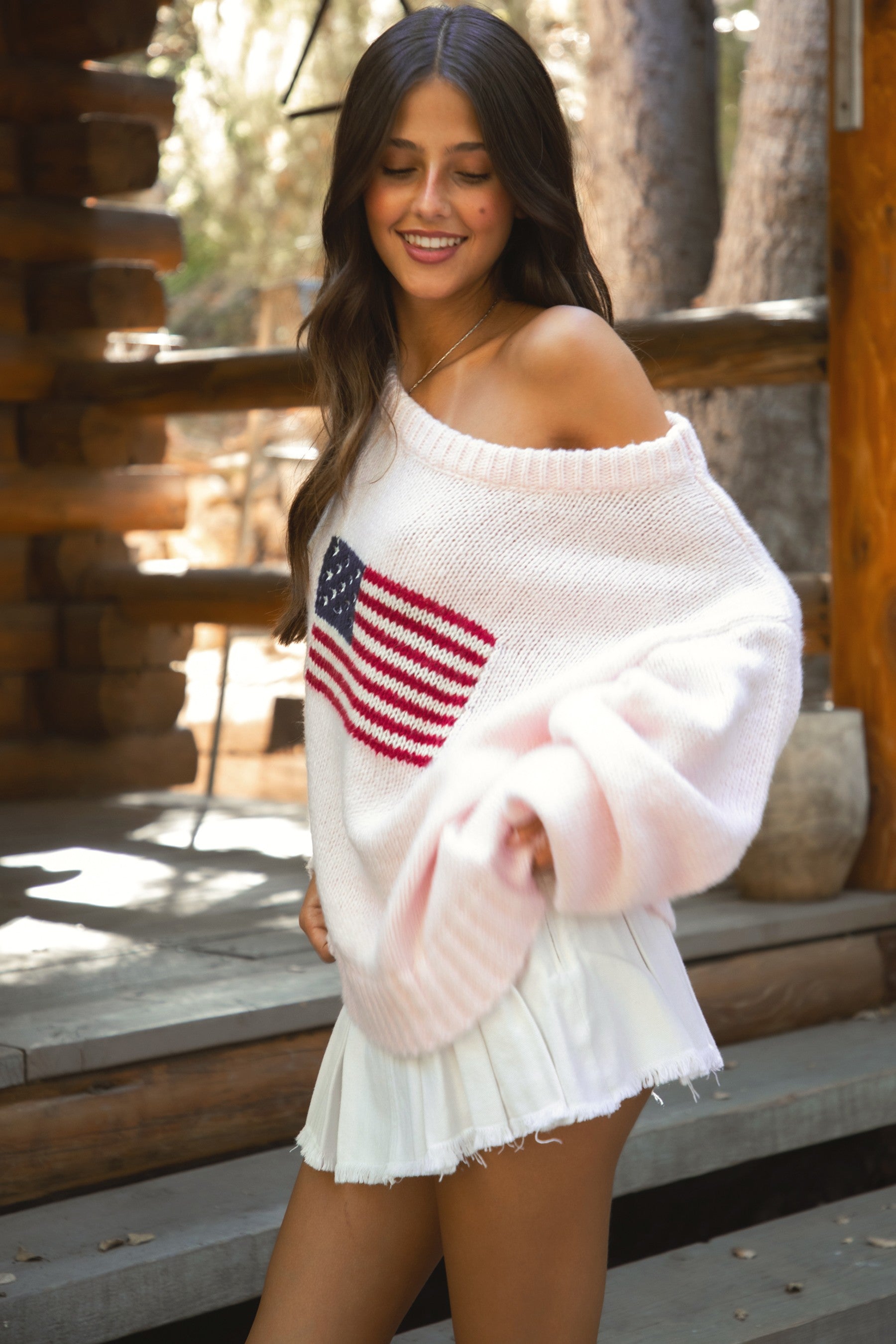 Celebrate in style with the Brandi Preppy American Flag Sweater in Cream. This semi-oversized, ribbed knit pull-over features a charming boat neck that can be worn off the shoulder for a flirty touch. Long, loose sleeves and a ribbed hem keep it casual and comfy—perfect for summer 4th of July fun or cozy fall game days. Crafted from 100% acrylic, it’s a playful staple that adds patriotic cheer to every outfit.