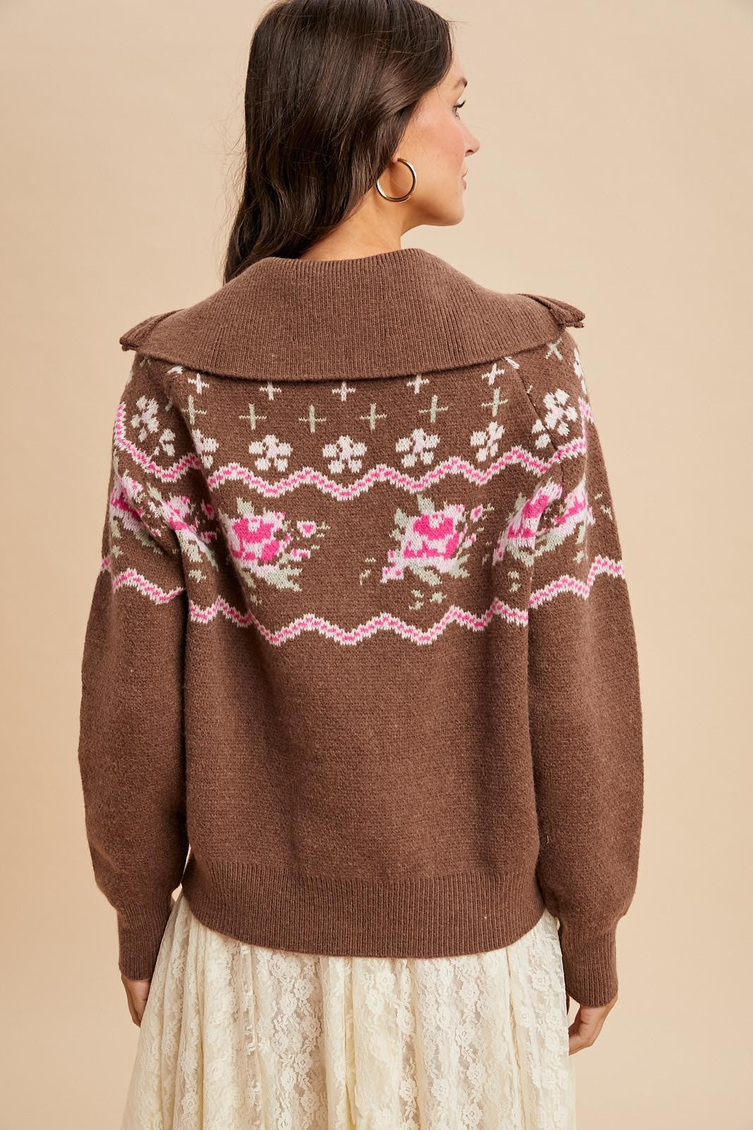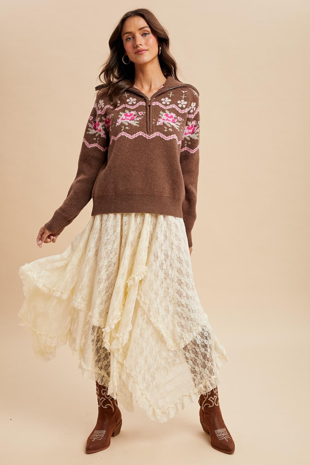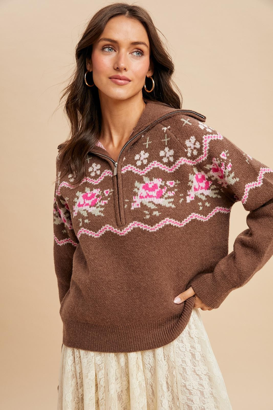 Cozy up in this charming Chestnut Half Zip Pullover, where timeless style meets modern comfort. The playful floral Fair Isle pattern adds a pop of personality to your everyday wardrobe, while the convenient half-zip design lets you adjust your warmth on the fly. Ribbed banding at the hem keeps everything in place, and the thoughtfully blended fabric—combining polyester, nylon, and wool—delivers durability without sacrificing softness. Perfect for layering or wearing solo, this knit is your new go-to for effortless, put-together looks.