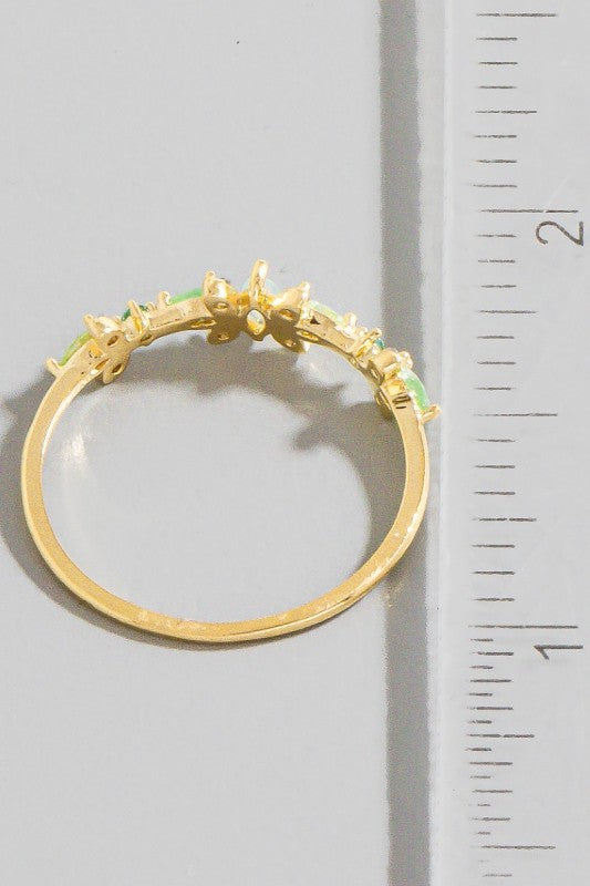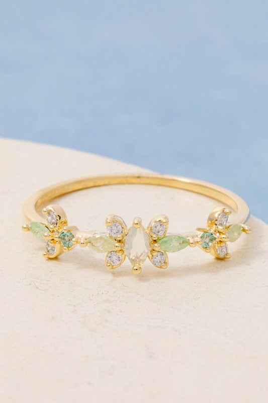 Elevate your everyday look with this dainty multi-colored studded ring that's equal parts sparkle and sophistication. Crafted from quality brass with shimmering cubic zirconia leaf accents, this delicate piece adds just the right amount of glamour without the fuss. Perfect for stacking or wearing solo, it's the accessory that whispers "I've got style" without shouting about it. Ring size 6.5. Because sometimes the smallest details make the biggest fashion statements!