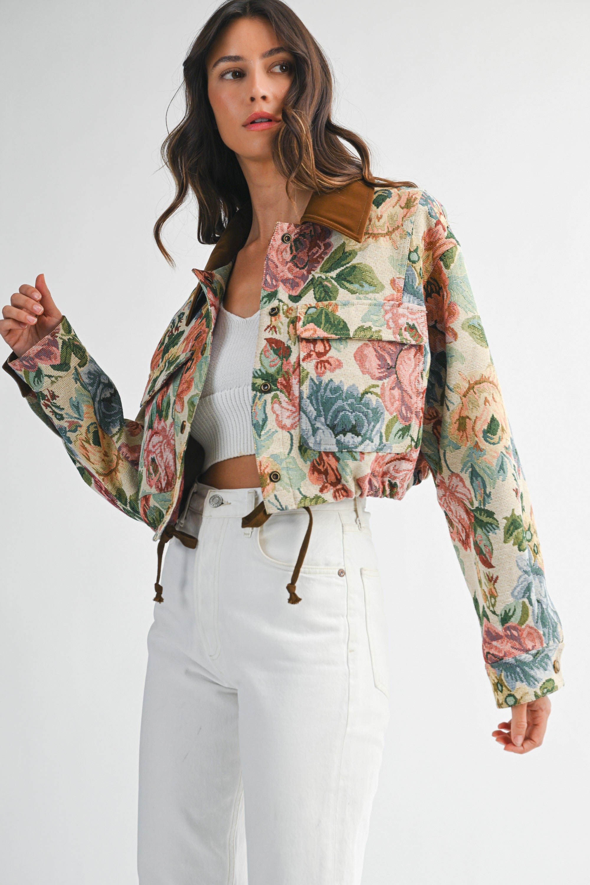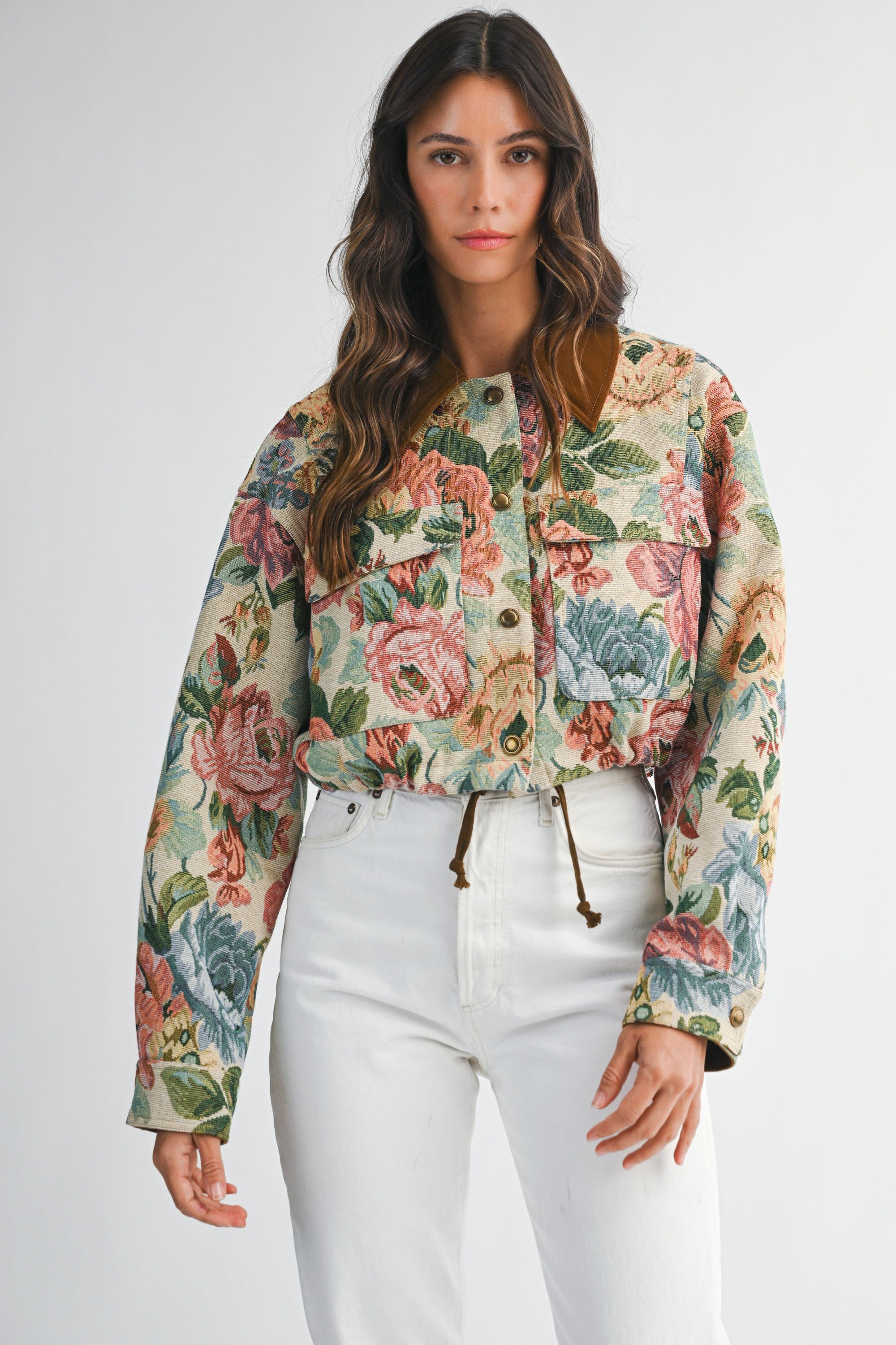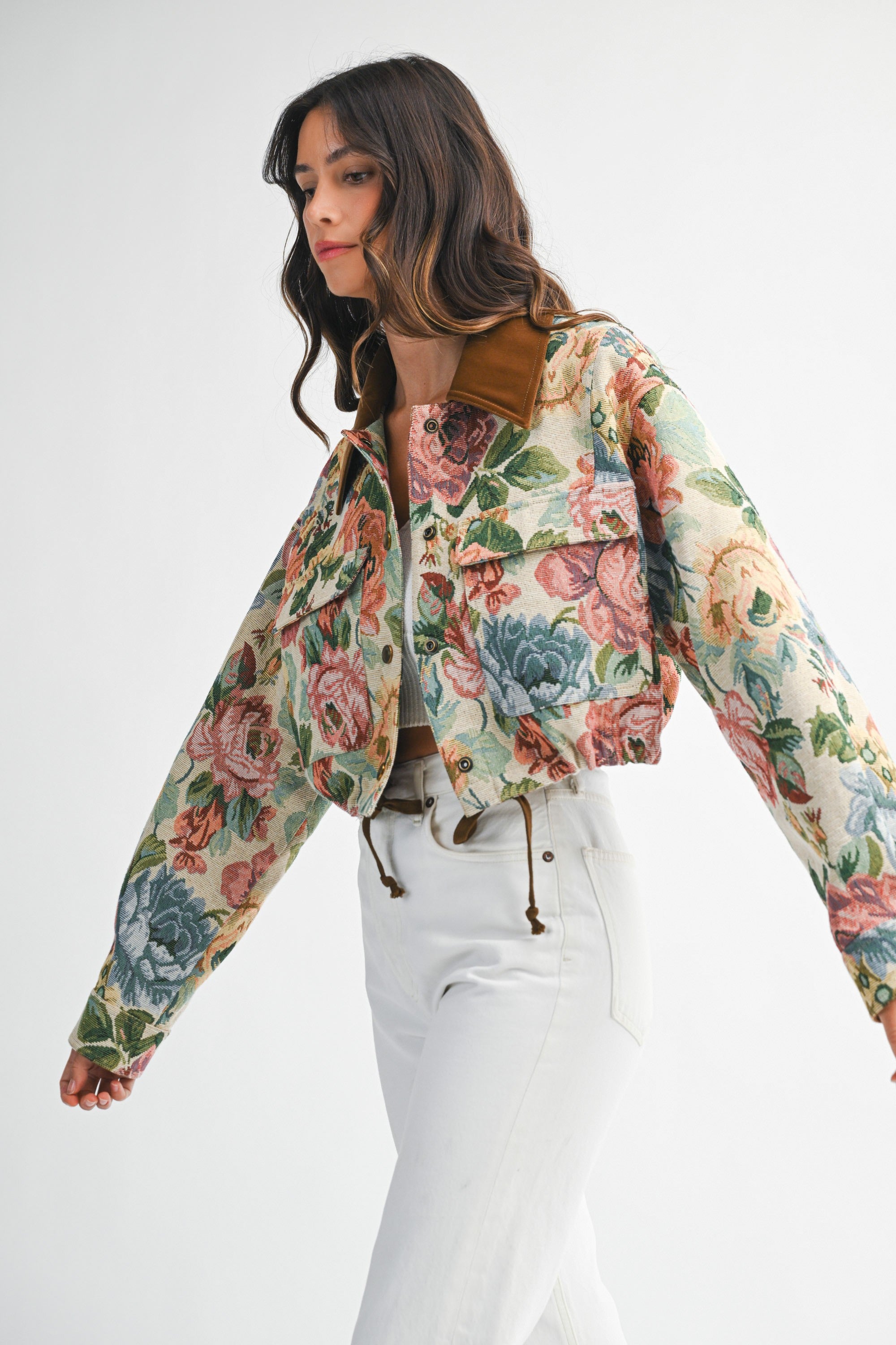 Step into spring with this charming floral tapestry barn jacket that blends vintage vibes with modern style. The cropped silhouette flatters every frame, while the contrast suede collar adds an unexpected touch of sophistication. Snap button closures make layering effortless, and long sleeves keep you cozy during cooler days. Lined for comfort and crafted from a durable poly-cotton blend, this jacket transitions seamlessly from weekend adventures to casual outings. A statement piece that proves functional fashion can be absolutely delightful.