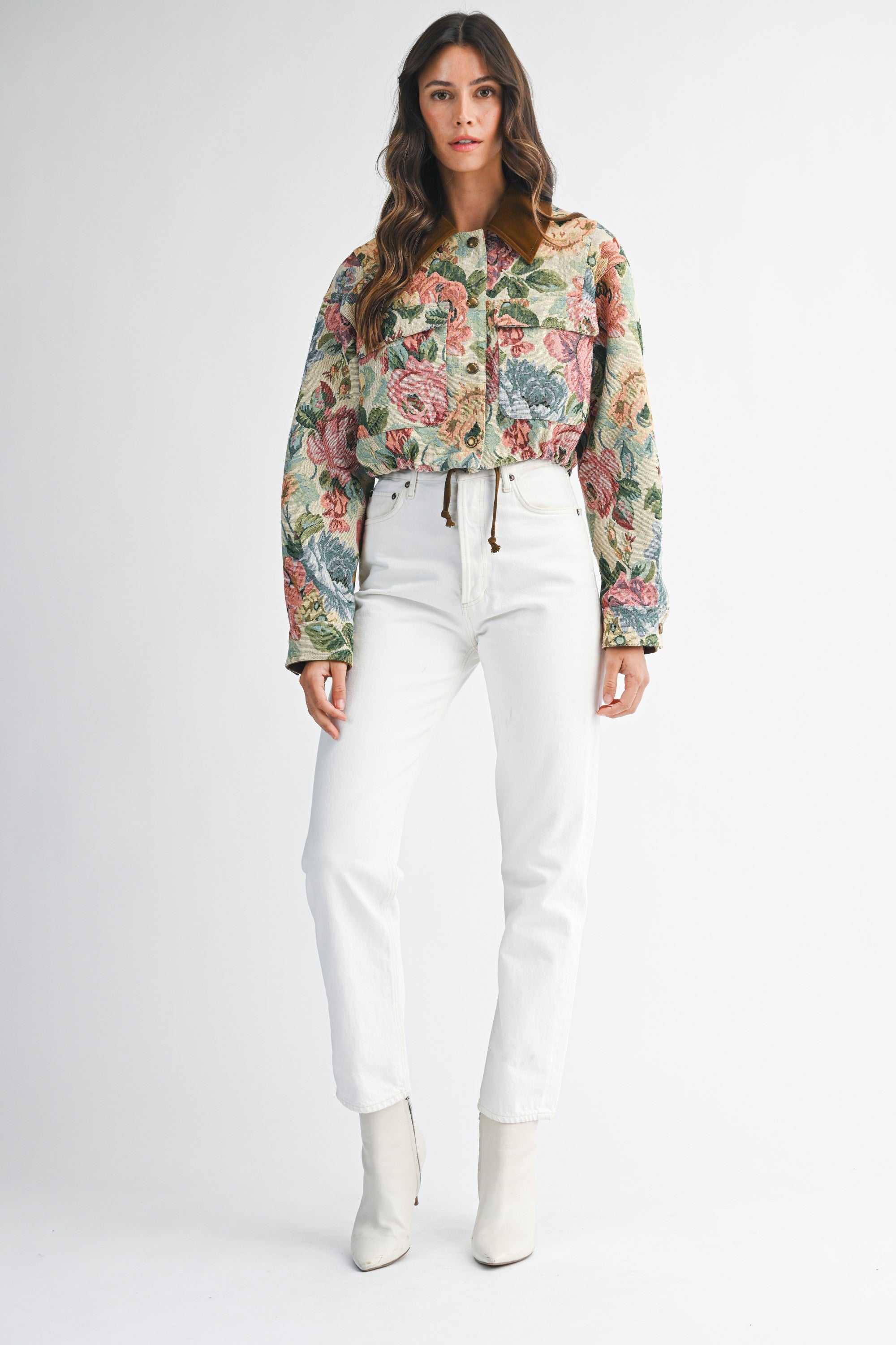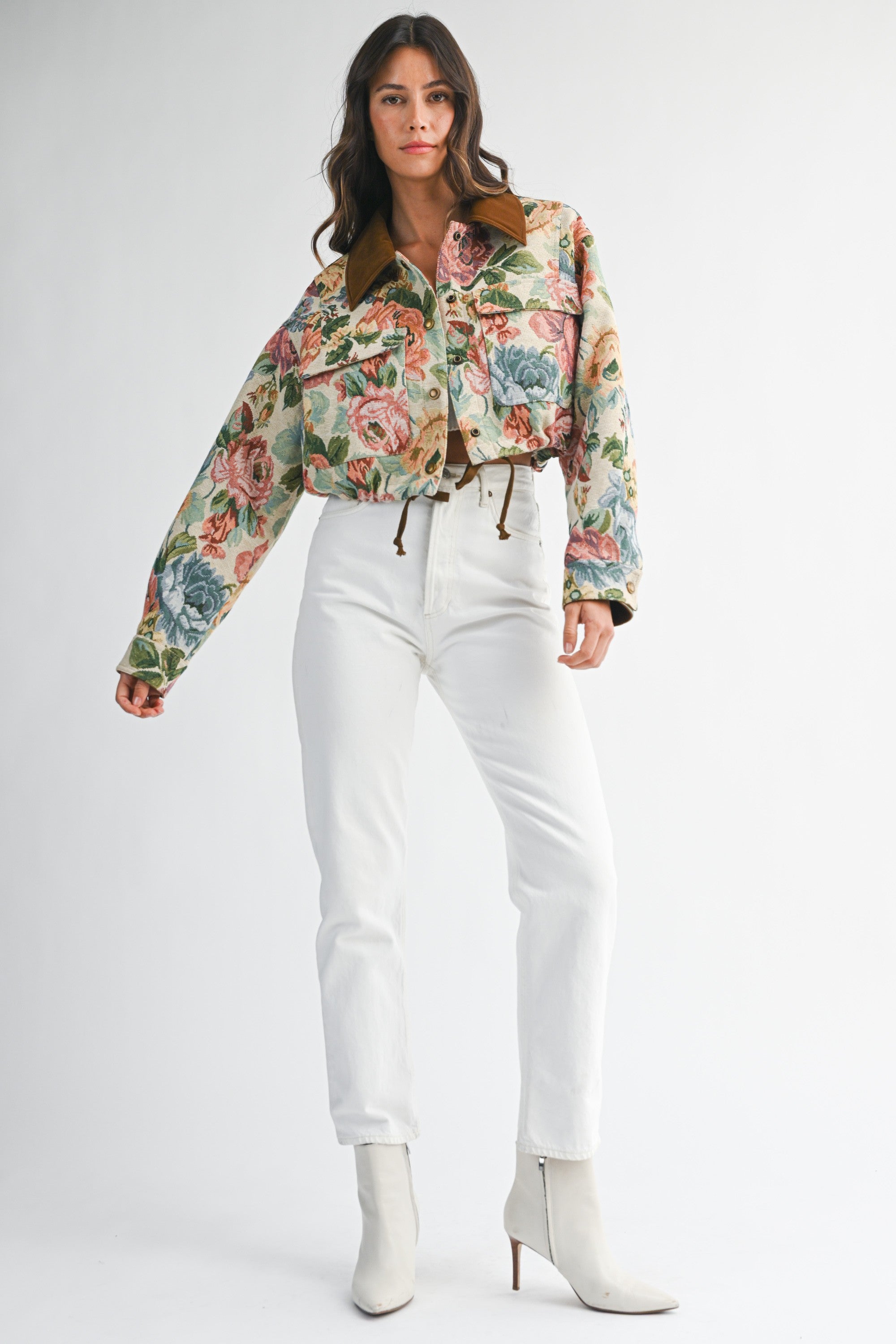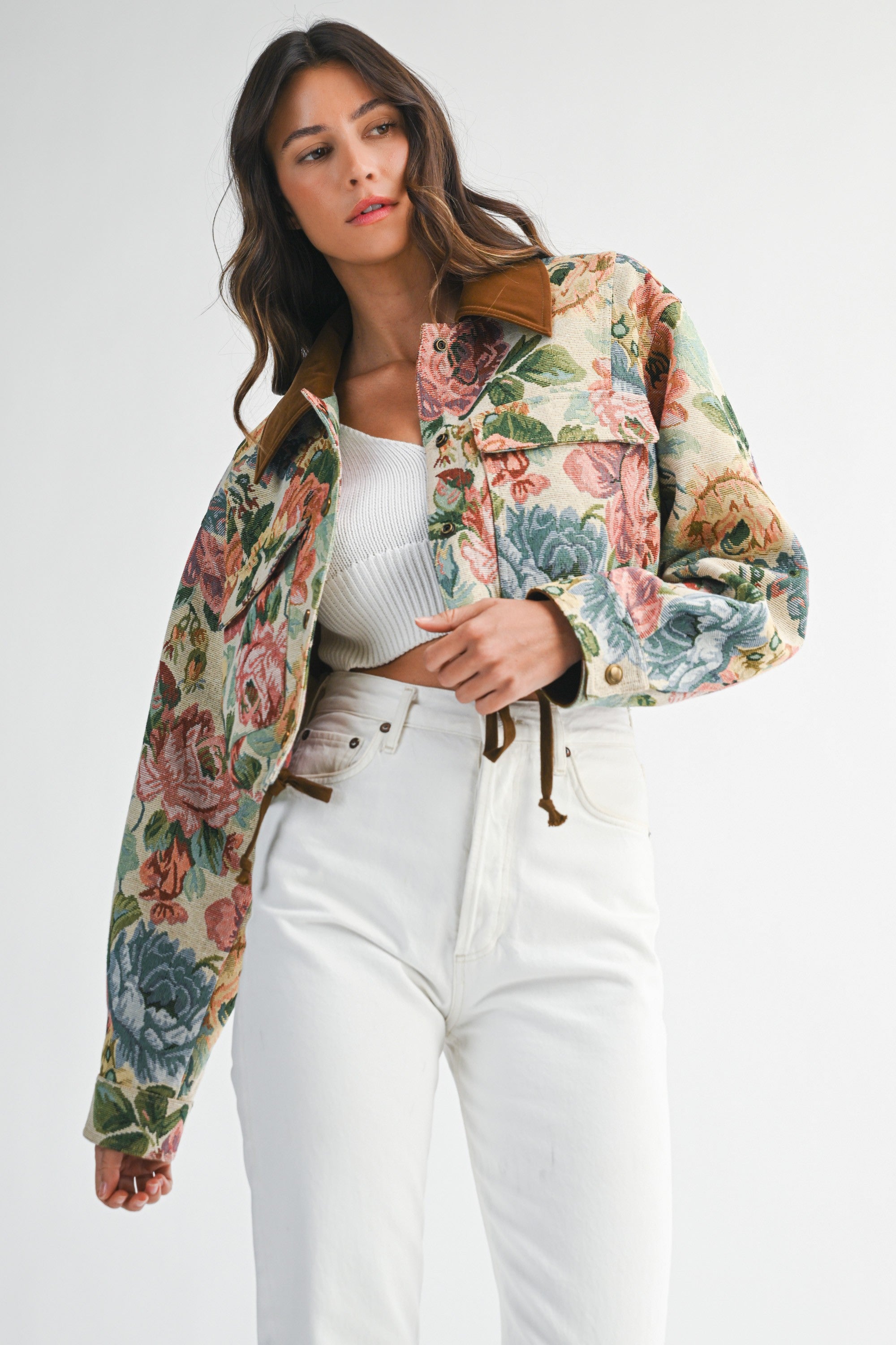Step into spring with this charming floral tapestry barn jacket that blends vintage vibes with modern style. The cropped silhouette flatters every frame, while the contrast suede collar adds an unexpected touch of sophistication. Snap button closures make layering effortless, and long sleeves keep you cozy during cooler days. Lined for comfort and crafted from a durable poly-cotton blend, this jacket transitions seamlessly from weekend adventures to casual outings. A statement piece that proves functional fashion can be absolutely delightful.
