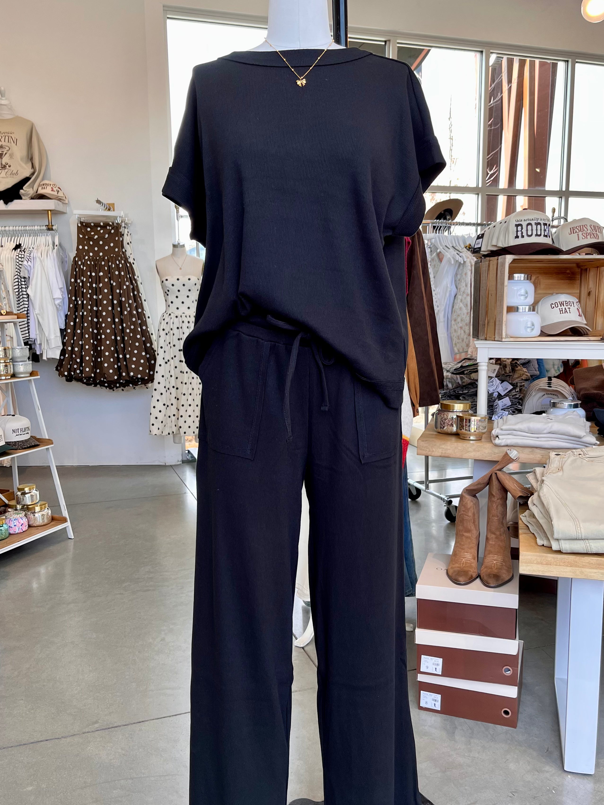 Lounge Club Tee & Pants Set Elevate your everyday comfort with this essential ribbed tee and pants duo. Crafted from soft, breathable fabric, the set features a classic short-sleeve tee paired with relaxed-fit pants—perfect for lounging at home, running errands, or casual hangouts. The ribbed texture adds subtle sophistication while maintaining that cozy feel you crave. Whether you're unwinding after a long day or keeping it laid-back on weekends, this versatile set delivers effortless style without compromising on comfort. A wardrobe staple that works as hard as you do.