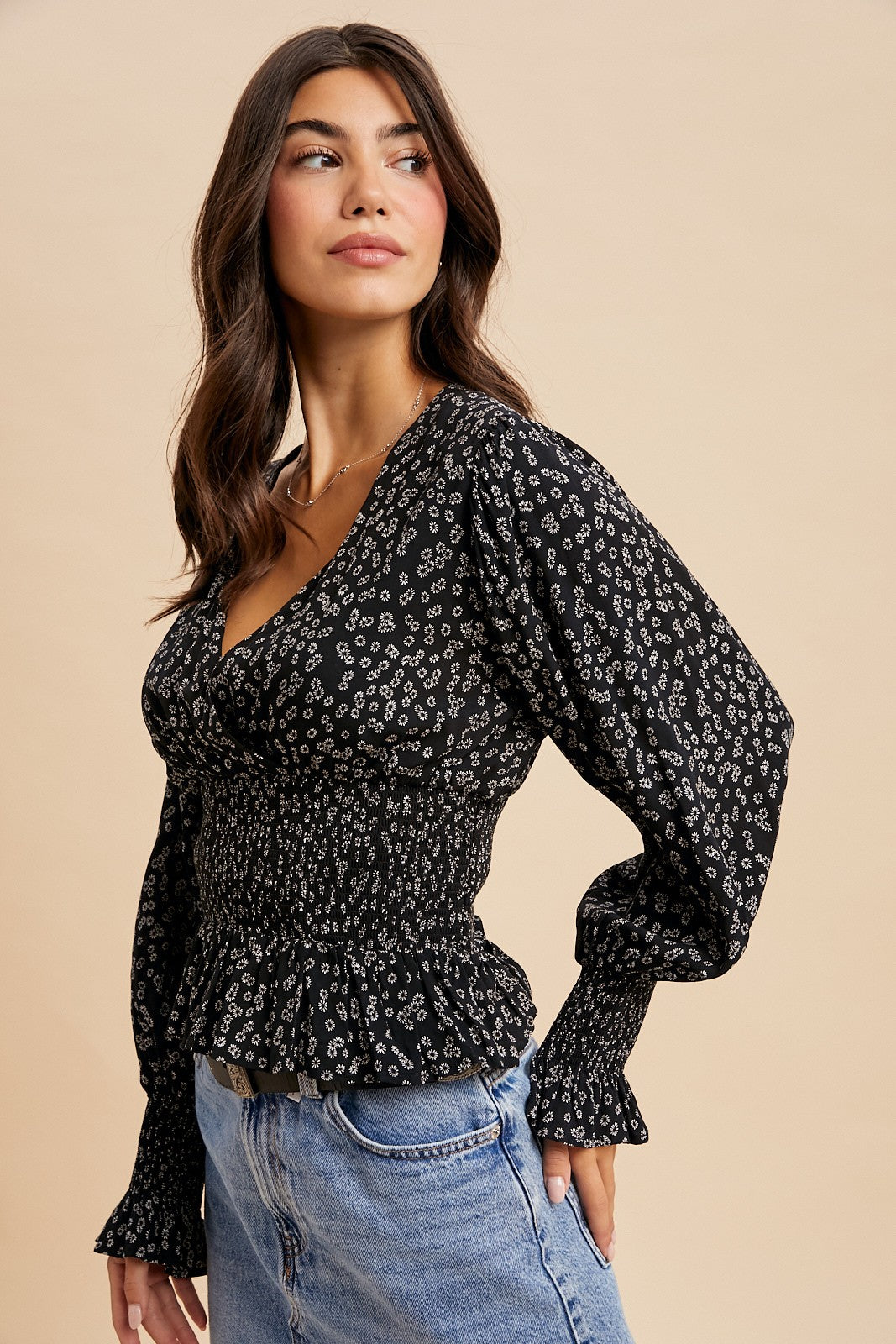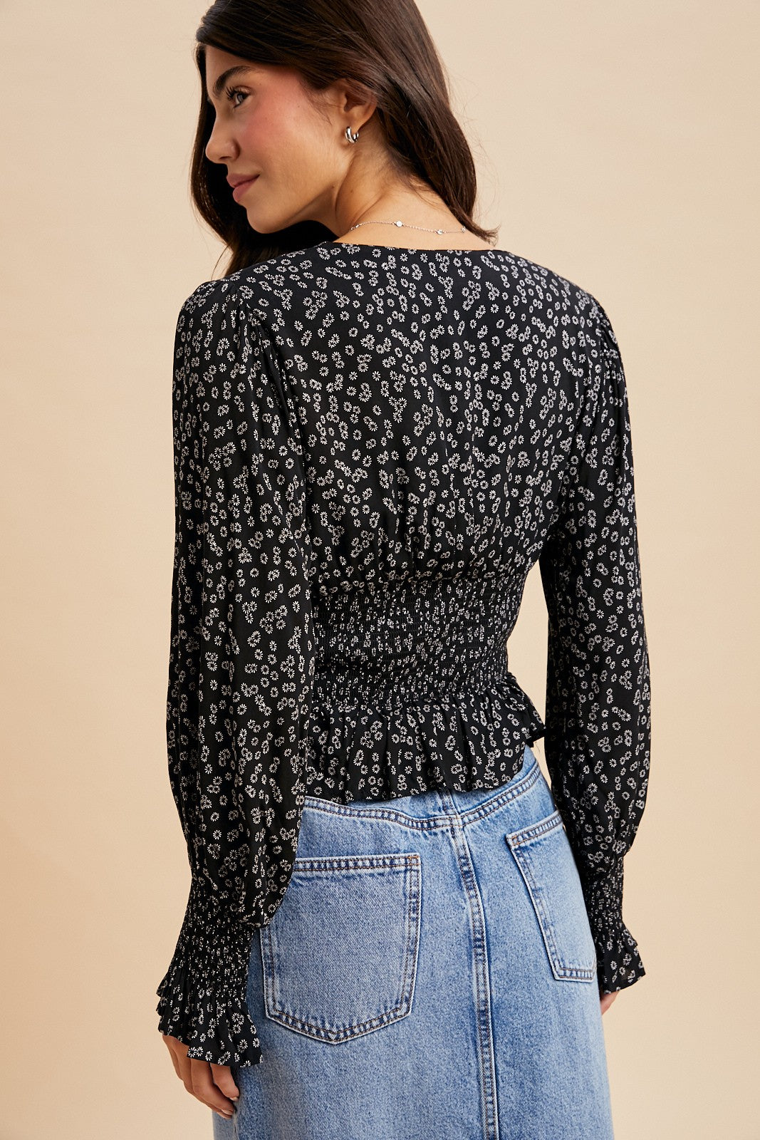 Embrace effortless charm with this delightful ditsy floral blouse, where whimsy meets wearability. The romantic surplice neckline flatters every frame, while the smocked waist creates a polished silhouette that feels as comfortable as it looks. Finished with lined construction and smocked wrists for added detail, this piece transitions seamlessly from casual brunches to evening adventures. Perfect for anyone who loves a touch of botanical beauty with a playful twist.