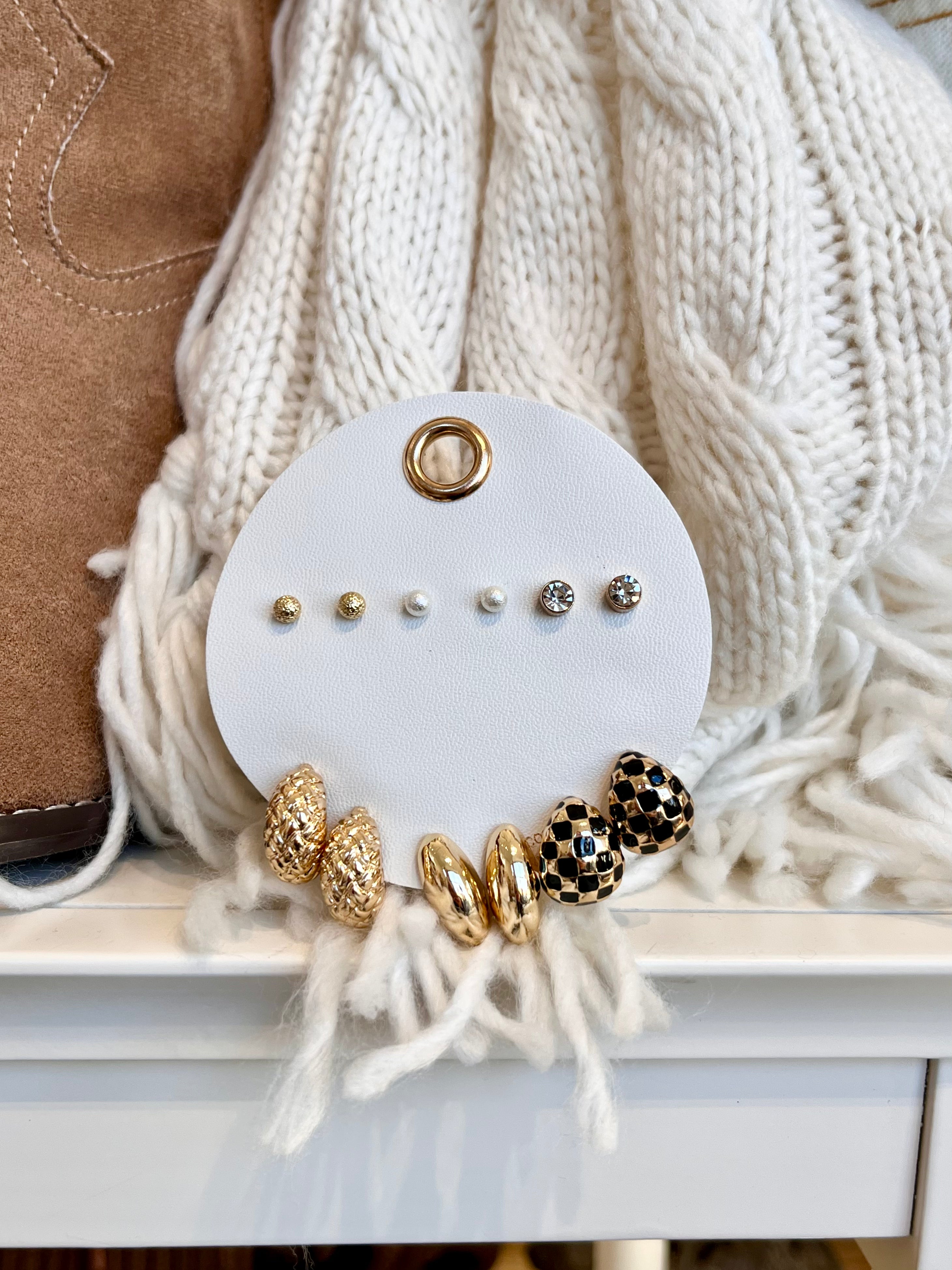 Mix and match your way to endless ear candy with this vibrant six-pair earring collection. From timeless gold studs and lustrous pearl accents to sparkling diamond studs, you'll find the perfect pair for any mood. Switch things up with our textured woven hoops, sleek gold hoops, and bold gold-and-black checkerboard design. Whether you're layering, stacking, or going solo, this versatile set keeps your jewelry box fresh and your style on point.