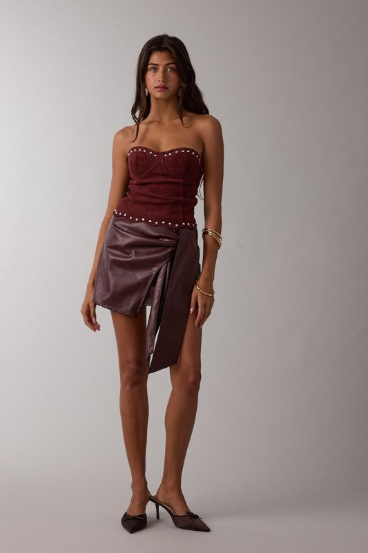 The Rebel Studded Top is your ticket to turning heads. This strapless tube crop features a flirty scallop neckline and edgy studded detailing that screams confidence. The sweetheart neck hugs you just right, while the back zipper makes getting dressed (and undressed) a breeze. Crafted from a stretchy poly-spandex blend, it moves with you all night long. Perfect for date night, nights out, or whenever you're ready to make a statement.