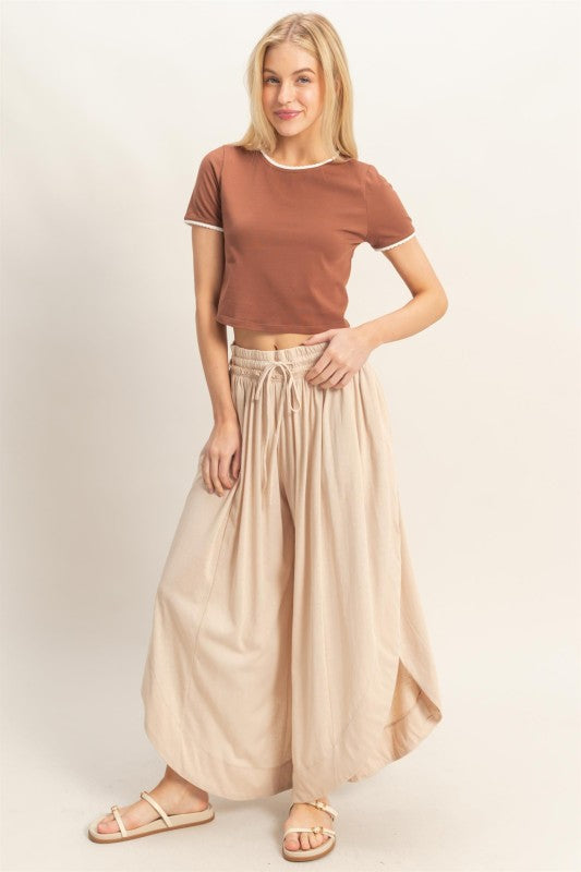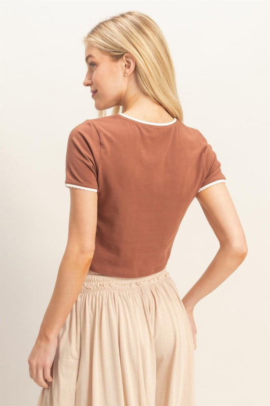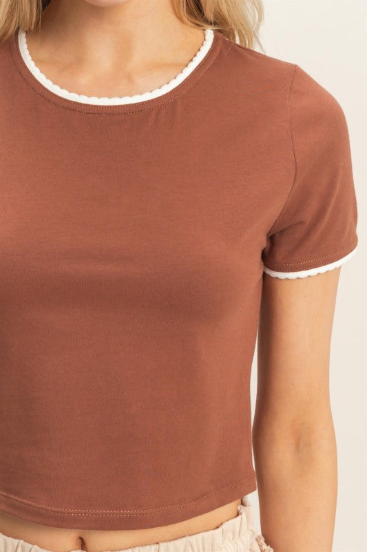 Elevate your everyday wardrobe with this charming Scallop Trim Crew Neck Top, where timeless style meets thoughtful design. The rich brown fabric pairs beautifully with crisp white scalloped trim at the neckline, creating a polished look that transitions effortlessly from casual outings to weekend gatherings. The crew neck silhouette offers comfortable, flattering coverage, while the delicate scallop detailing adds a touch of feminine sophistication. Perfect for layering or wearing solo, this versatile piece becomes an instant favorite in your closet.