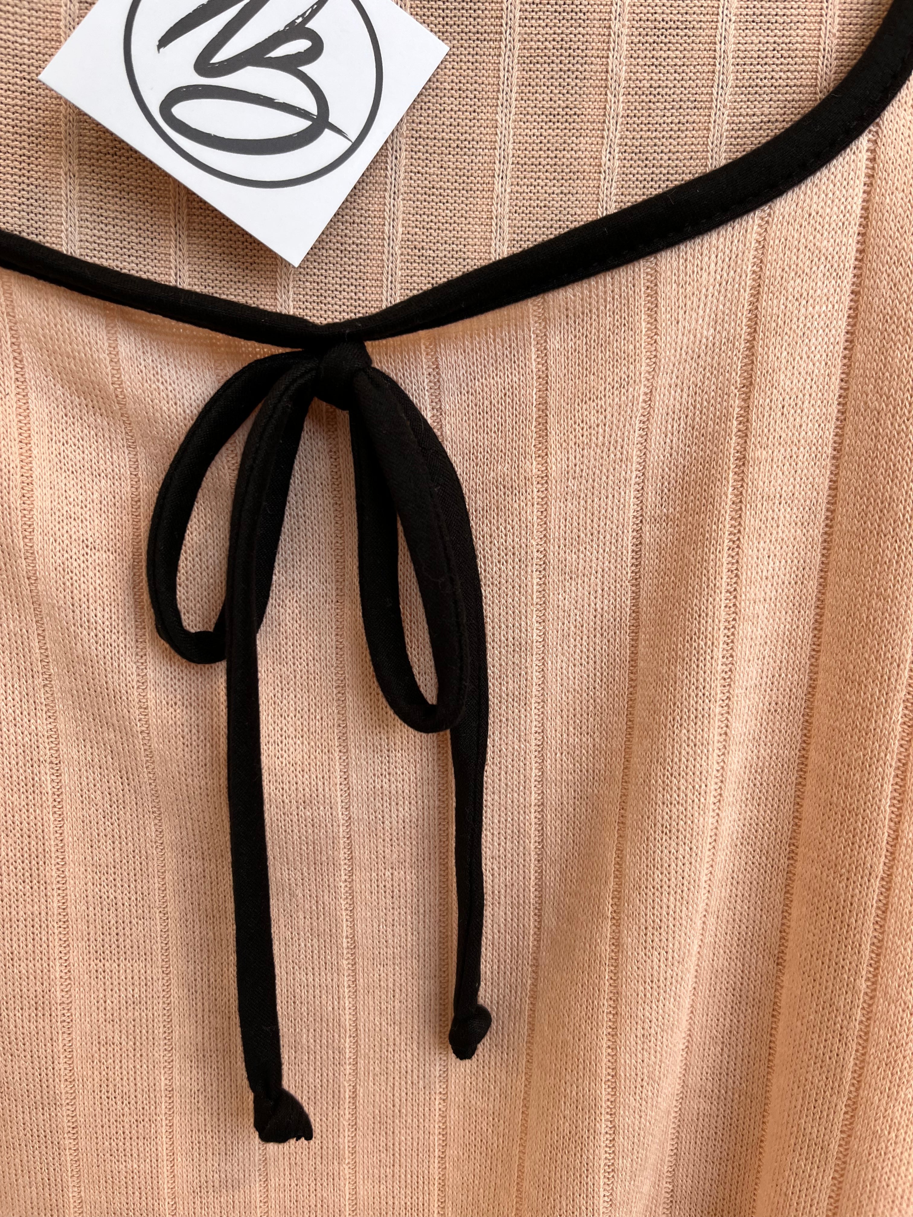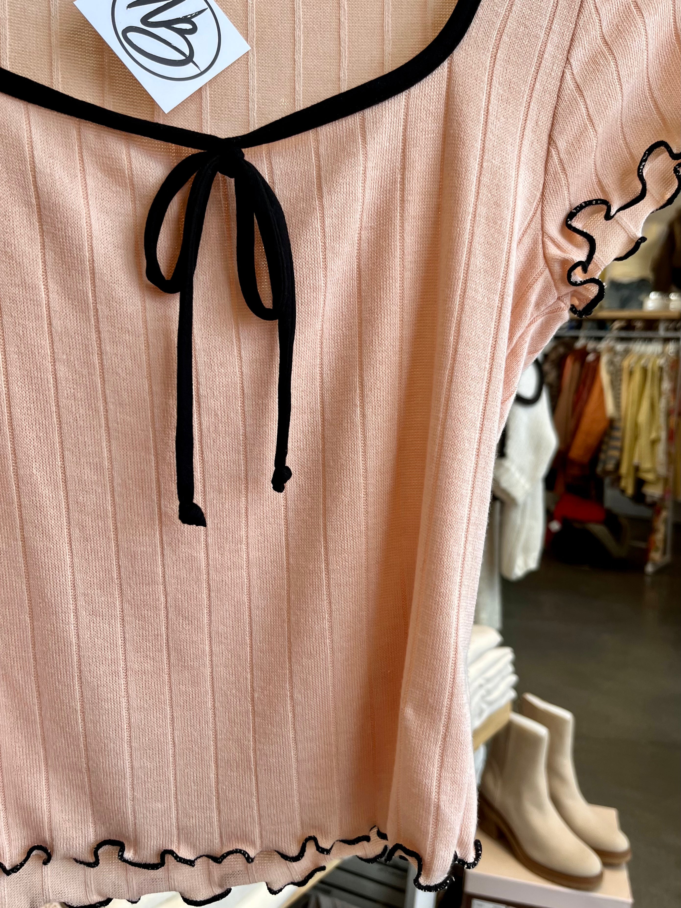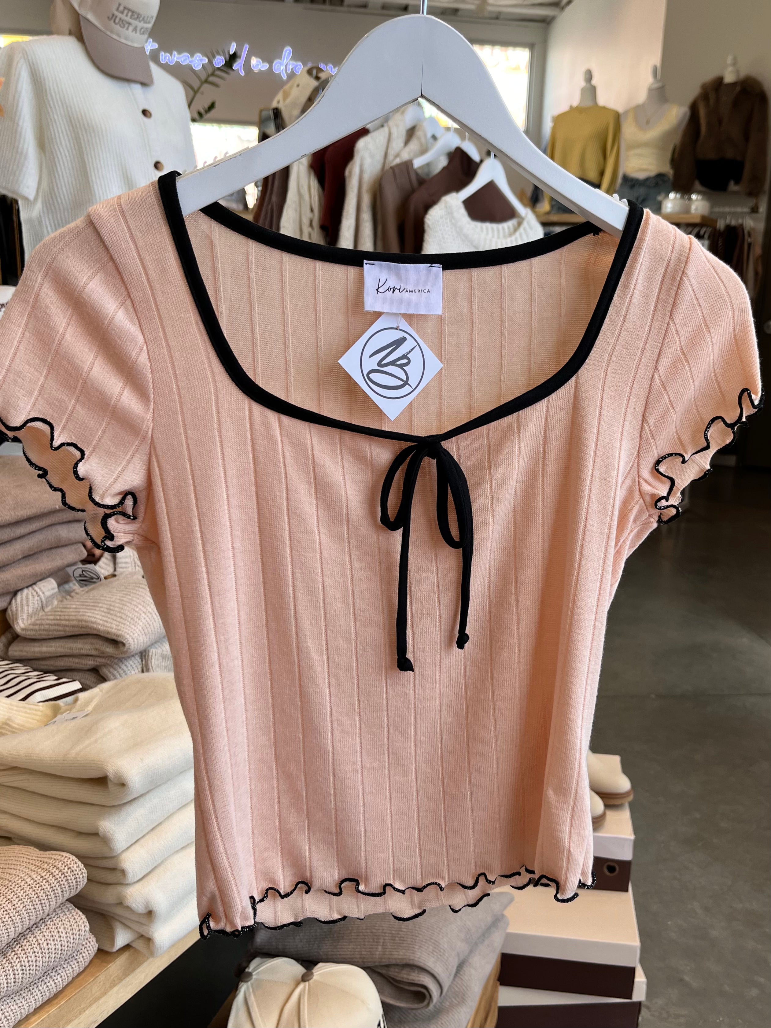 Elevate your everyday style with this charming square neck ribbon top—a playful twist on a classic silhouette. The structured neckline frames your shoulders beautifully while delicate ribbon detailing adds a touch of whimsy and sophistication. Perfect for dressing up casual outfits or layering over your favorite basics, this versatile piece transitions seamlessly from day to night. Whether you're exploring new destinations or enjoying a night out, this top brings effortless elegance to any wardrobe.