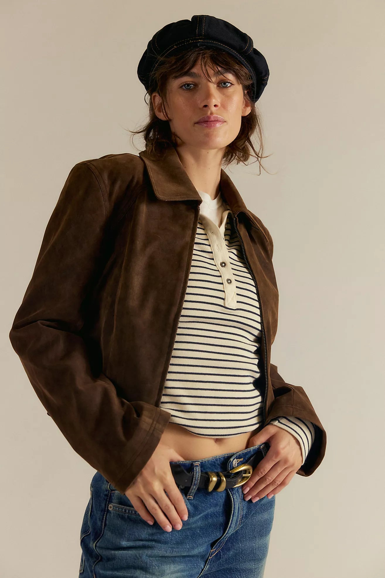 Turn back time with this 70s-inspired, sleek vegan suede jacket from We The Free, featured in a cropped fit with a classic pointed collar and wide cuffs.